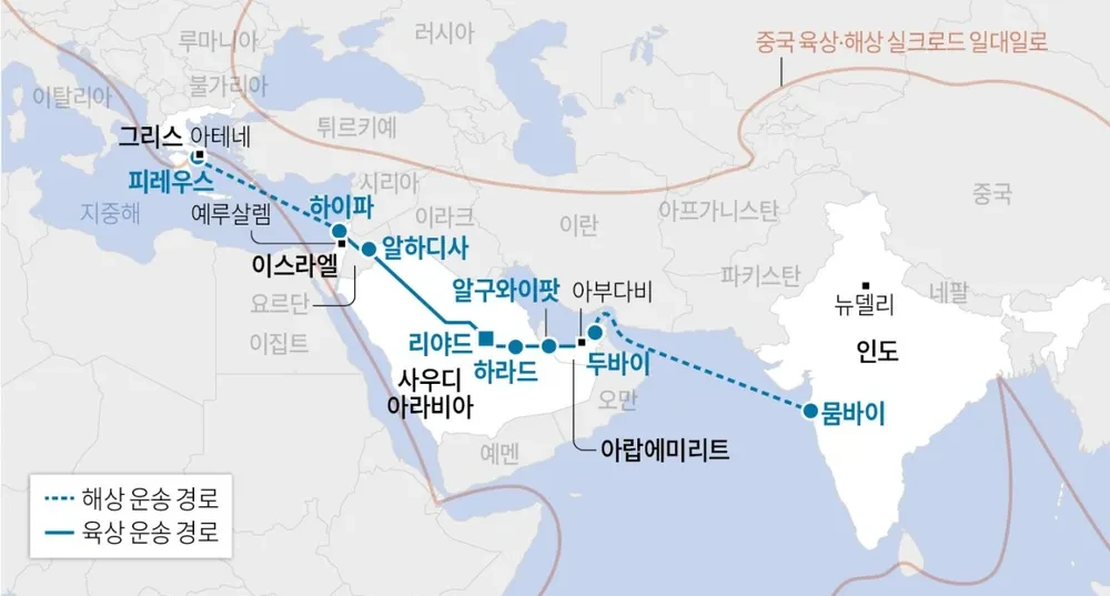 핵심은 이거야. 미국과 유럽이 주도하고 인도가 실행하는 IMEC(인도-중동-유럽 경제 회랑). 단순히 물건 실어 나르는 길이 아니야. 중국의 일대일로를 완벽하게 무력화하고, 전 세계 경제의 혈관을 통째로 새로 바꾸려는 원대한 계획이거든.